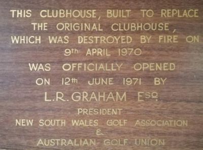 In early 1970 the club was able to arrange with the Waters Resources Commission for a licence to pump from the main canal and to irrigate 37 acres. The instigator and driving force behind this ambitious project was the President Mr JH Ainsworth. In March 9170 the work of laying the pipes to the course was carried out by a working bee extending over one weekend. The pumps and pipeline were tested and on the morning of 9th Apsil 1970 the 1st water was delivered into the storage dam (located on 13th Hole) That night the Clubhouse and all the contents were destroyed by fire. A new Clubhouse was built and 12th June 1971 it was officially opened by the President of NSW Golf Association Mr Les Graham.